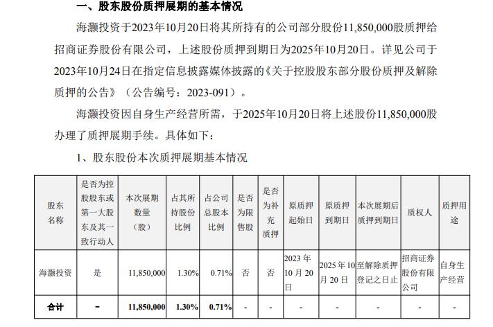 10月21日,海大集团控股股东——广州市海灏投资有限公司(下称“海灏投资”),将持有并质押予招商证券的1185万股股份进行了展期,占公司总股本约0.71%,质押用途为自身生产经营。