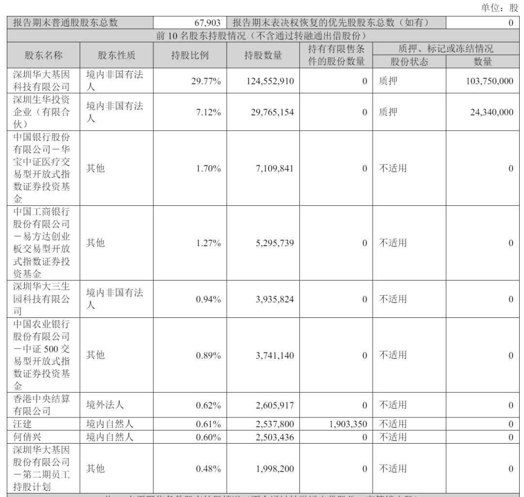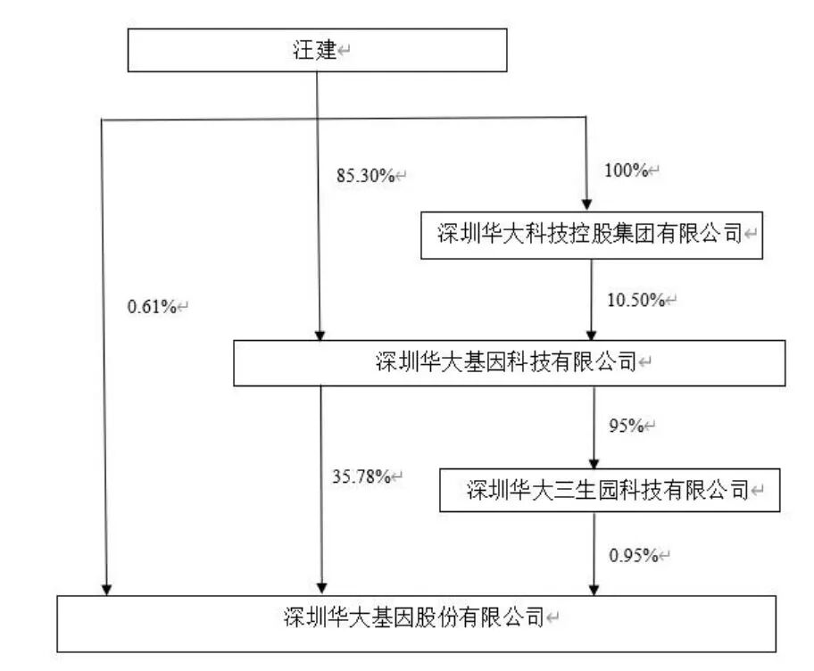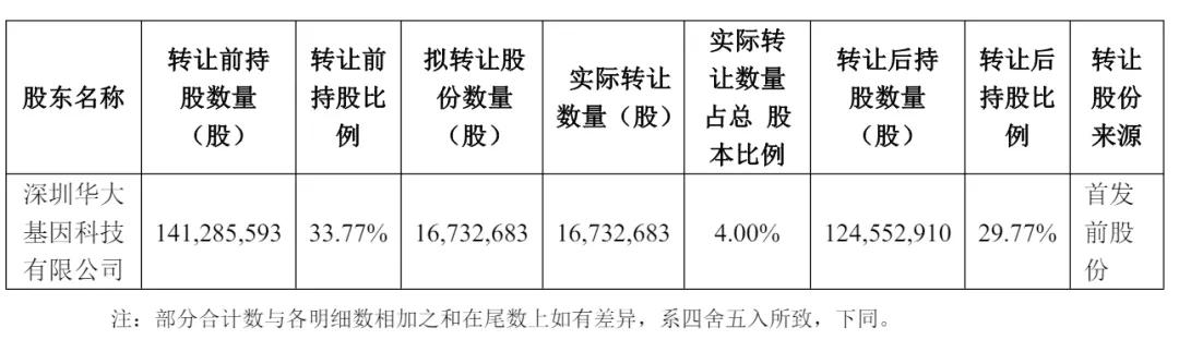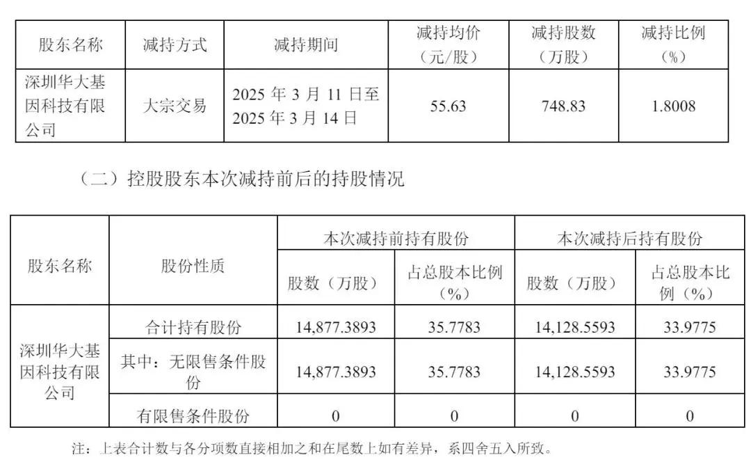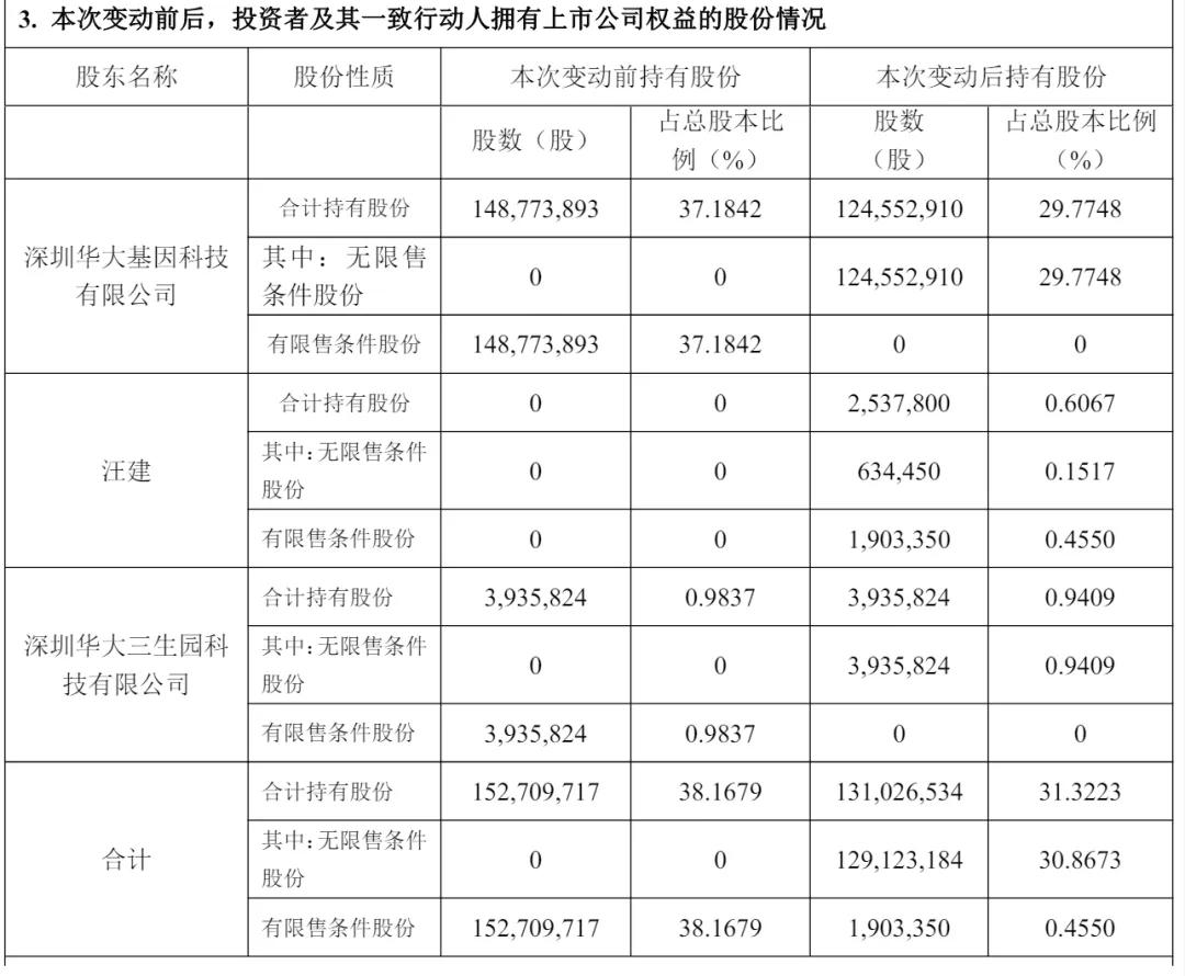 减持后,华大控股持股29.7748%,华大基因创始人汪健直接持股为0.6067%,深圳华大三生园科技有限公司持股为0.9409%。