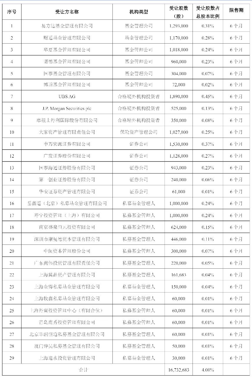 一共有29家基金接盘,其中,易方达基金管理有限公司认购1,293,000股,财通基金管理有限公司认购1,170,000股;