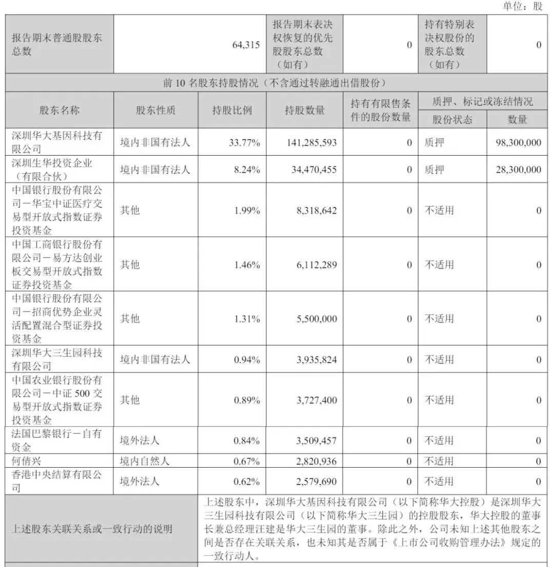 截至2025年6月30日,深圳华大基因科技有限公司持股为33.77%,深圳前海华大基因投资企业(有限合伙)持股为8.24%;