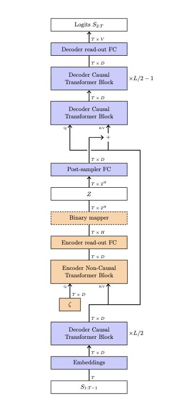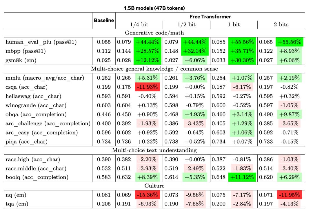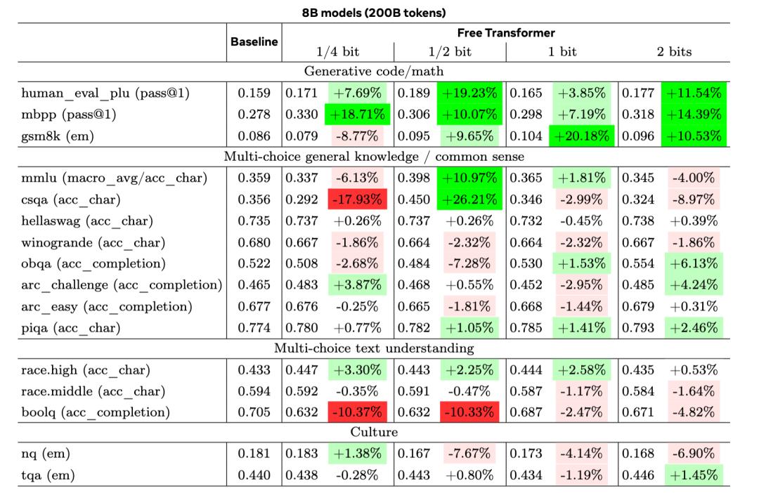 第三种架构名为Free Transformer,简化了这一过程。它直接在模型中间层注入随机状态,而非使用独立的全编码器。在训练过程中,编码器仍被使用一次,以帮助模型学会如何选取良好的隐藏状态,但它仅与网络的一部分协同工作。