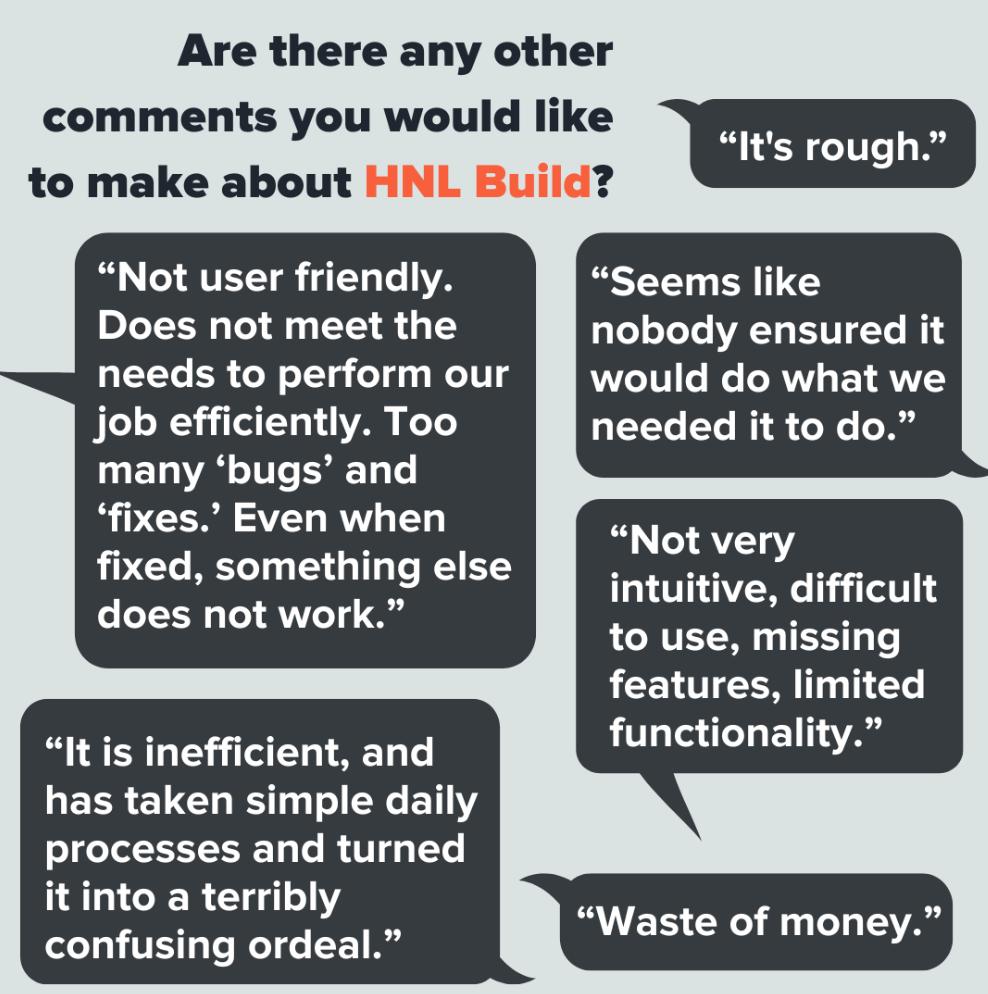 “如果此次系统升级的目标是让审批流程更顺畅,那我们完全偏离了方向。要让 HNL Build 追上旧系统(POSSE)的可用性,恐怕还要好几年。”
