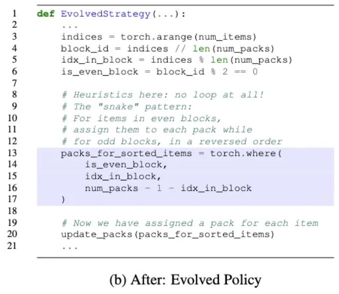 OpenEvolve生成的新算法发现了一种巧妙的启发式方法,用以替代线性for循环。