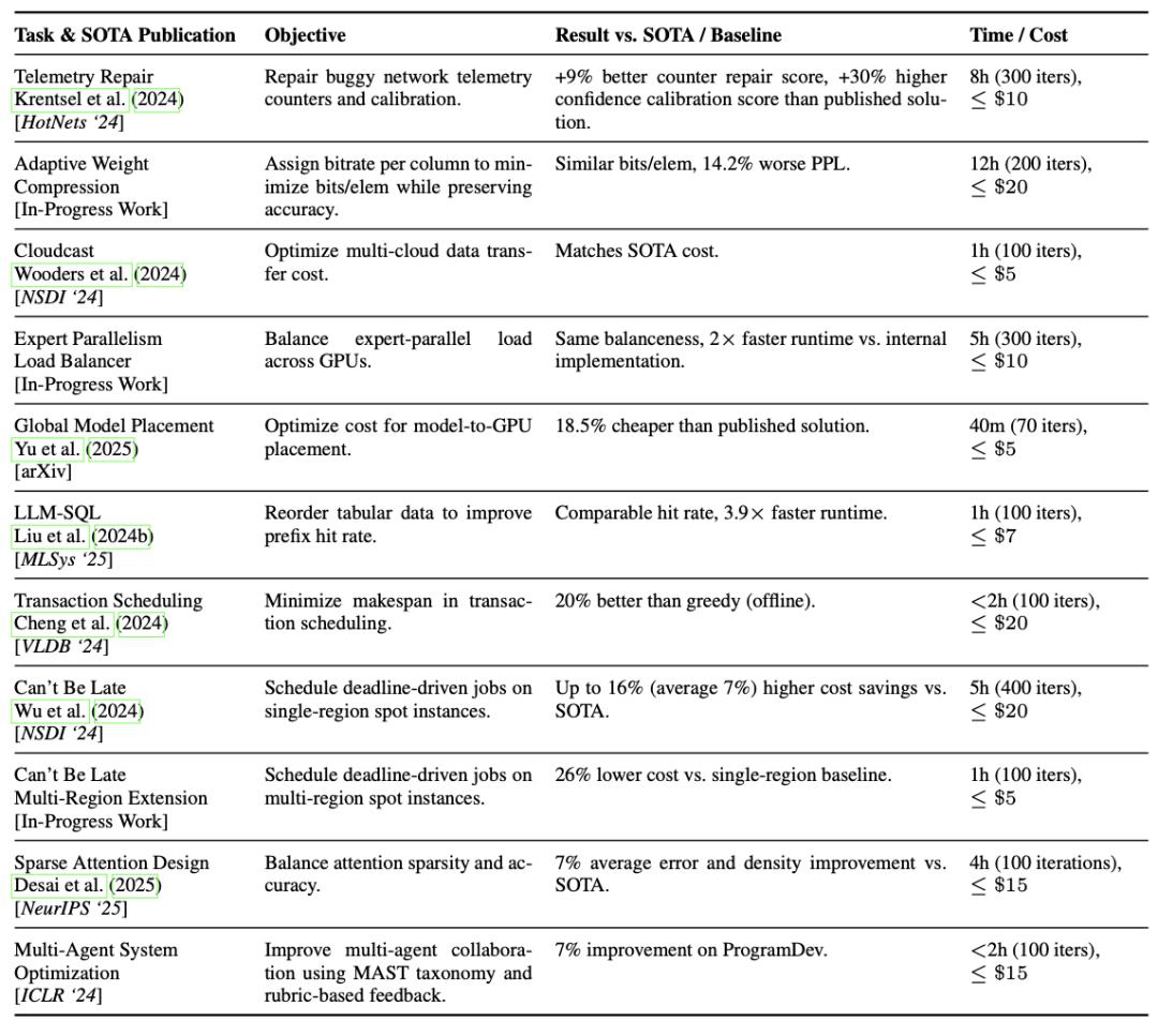 基于现有的开源ADRS框架OpenEvolve,团队在多个领域的案例研究表明,其发现的算法显著优于人类设计算法,实现了高达5倍的运行效率提升或26%的成本降低。