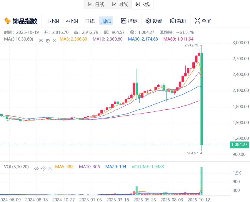 CSQAQ显示的饰品指数,前几天还保持着上涨趋势,但在走至高峰近2800点后,碰上V社补丁更新,骤降至1084点。