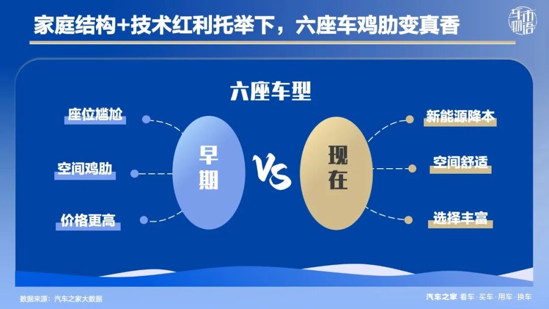 在家庭结构变化和技术红利的托举下,六座车由过去的鸡肋变真香,座位尴尬、空间鸡肋、价格更高不复存在,取而代之的是使用成本更低、空间更为舒适、选择丰富。六座车细分市场也由一个小众赛道转变成“新蓝海”,众多车企趋之若鹜,已开启全面发力。当更多的产品涌入市场后,竞争也会同步升级。