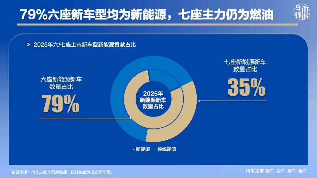 面对新的市场机遇,新能源车响应迅速。至2025年,79%的六座新车贡献来自新能源,远高于七座的35%。当前,七座新车依旧以燃油车为主力。在油价不断高涨的当下,新能源车更好地补足了“大车”使用成本高的短板,令用户没有后顾之忧,能够更快决策。