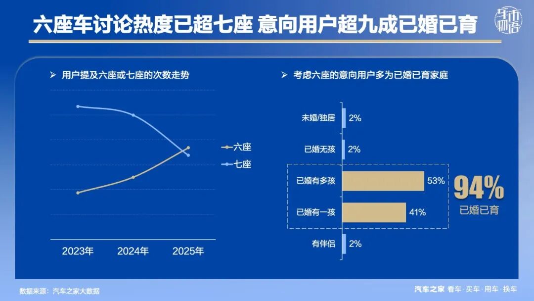 据汽车之家大数据显示,近三年,用户关注讨论六座的次数逐年快速增长,至2025年首度超越七座,而考虑购买六座车型的意向用户,超九成是已婚已育的多口之家。