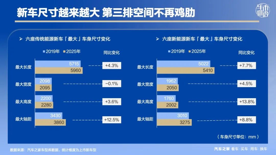 以往,大部分六座车的第三排座椅通常仅作为应急使用,因空间狭小、座位舒适度低等因素,很难实现长时间乘坐,若是儿童乘坐,空间尚可,但安全系数较低,故一直被诟病。如今,六座车的尺寸明显更大,相比2019年,2025年新能源六座车轴距同比增长8.8%,传统能源轴距同比增长12.5%,最大车长近6米。