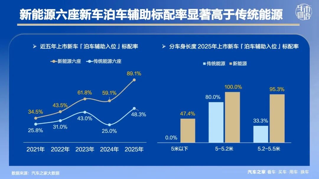 据汽车之家车型库数据显示,至2025年新能源六座新车泊车辅助入位的标配率跃升至89.1%,相比2021年增长了54.6个百分点。其中,车长5-5.2米的新车可实现100%标配。传统能源六座新车虽然标配率也在提升,但速度较慢,至2025年标配率仅为48.3%。