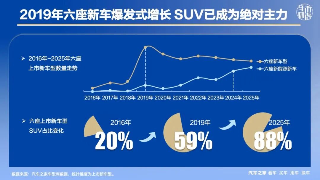 新车型中,SUV的占比越来越高,2016年还是以MPV为主的时代,SUV六座新车型占比仅20%。至2025年,SUV新车型占比跃升至88%,占据绝对主力,完美契合用户的消费偏好。