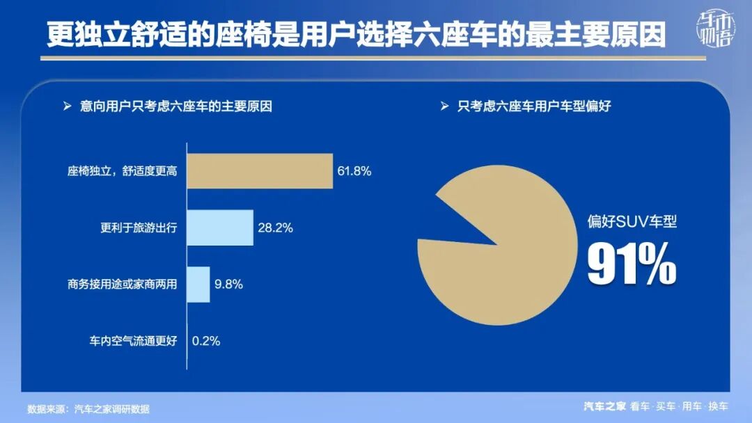 为什么用户会坚定地选择六座车型?座椅独立、舒适度更高深是最主要原因,占比高达61.8%,紧随其后的是更利于旅游出行,占比达到28.2%。此外,钟爱六座车型的用户还有一个显著特点,即超九成用户偏爱SUV。