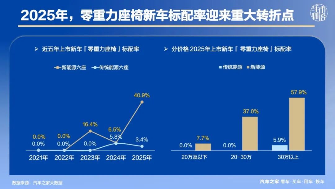 至2025年,新能源六座新车零重力座椅的标配率跃升至40.9%,不过,受困于成本限制,指导价30万以上的新车标配率明显更高,20万及以下新车仅7.7%。传统能源六座新车的反应相对迟缓,指导价30万以下的新车标配率为0%。