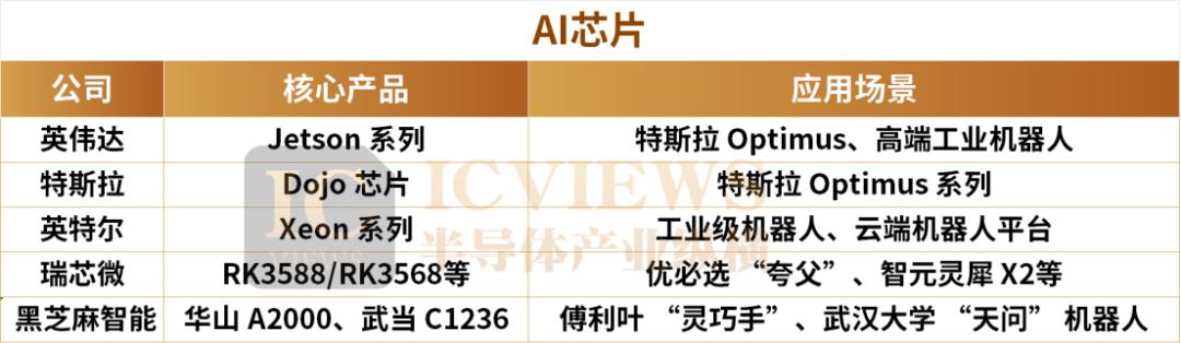 当前全球市场仍以英伟达 Jetson 系列、英特尔 Xeon 系列为主导,特斯拉自研的 Dojo芯片则专为 Optimus 机器人优化,这些产品凭借成熟的软件生态占据高端市场。