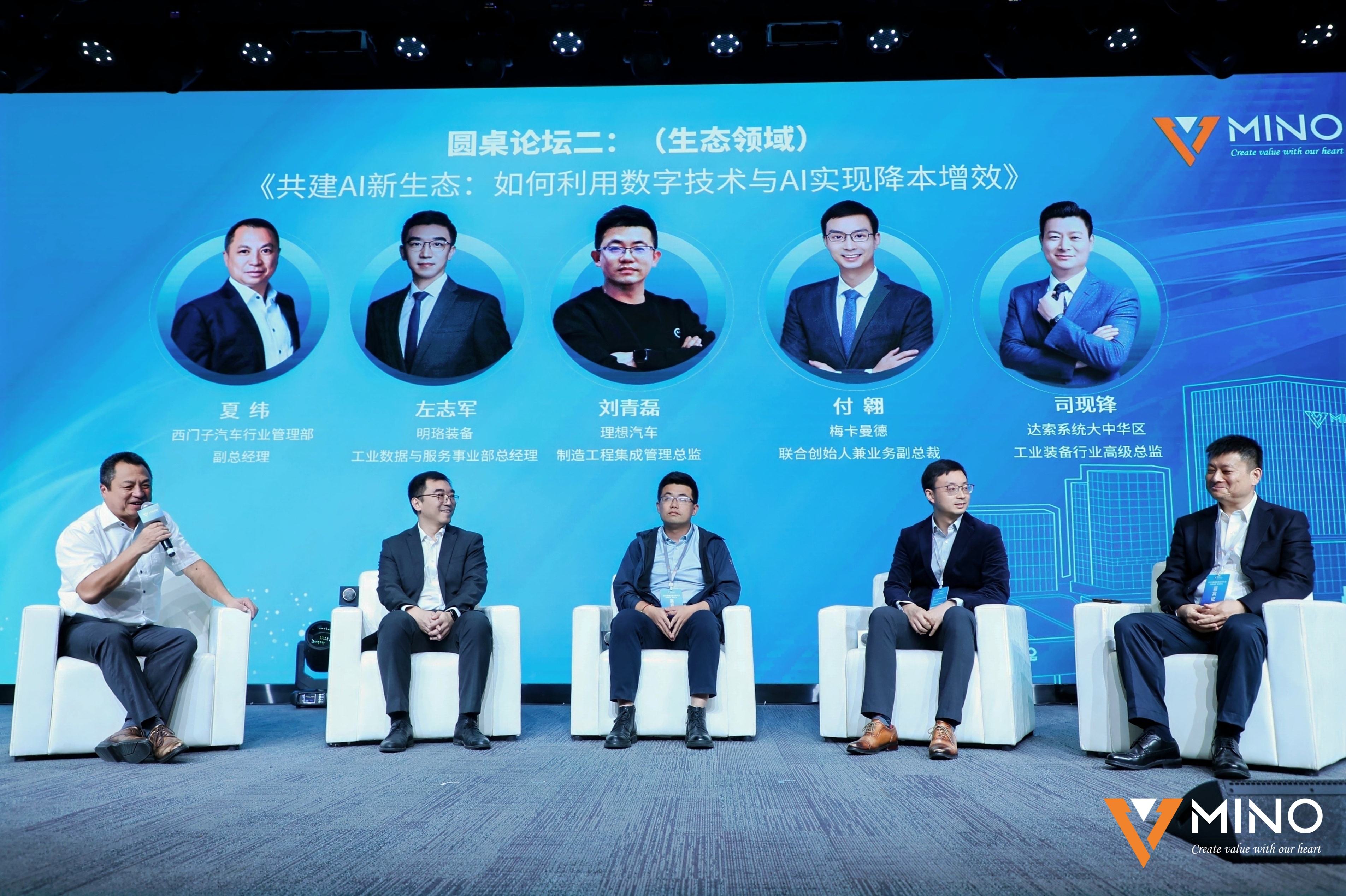 在下午举行的圆桌论坛环节,在西门子(中国)有限公司副总裁夏纬的主持下,明珞工业数据与服务事业部总经理左志军、理想汽车制造工程集成管理总监刘青磊、达索系统大中华区工业装备行业高级总监司现锋、梅卡曼德-联合创始人兼业务副总裁付翱围绕《共建AI新生态:如何利用数字化技术与AI实现降本增效》展开热议。嘉宾们强调了“AI+岗位”、“AI+产品”的实施路径,并提出通过功能标准化、部署轻量化和合作灵活化,推动AI技术在中小企业中实现普惠化落地。