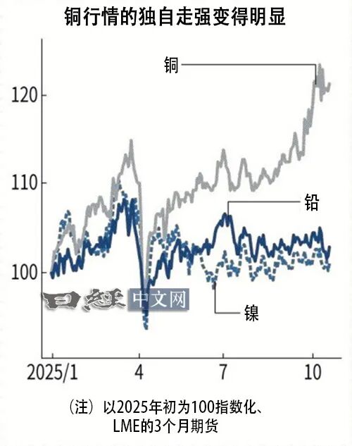 另一方面,用于纯电动汽车(EV)电池和不锈钢的镍则持续处于低价区间。LME的3个月期货10月20日降至每吨1万5222美元,比作为最近高点的2024年5月跌了3成左右。另外,用于汽车电池等的铅也仅比2025年初上涨3%,维持上涨乏力态势。