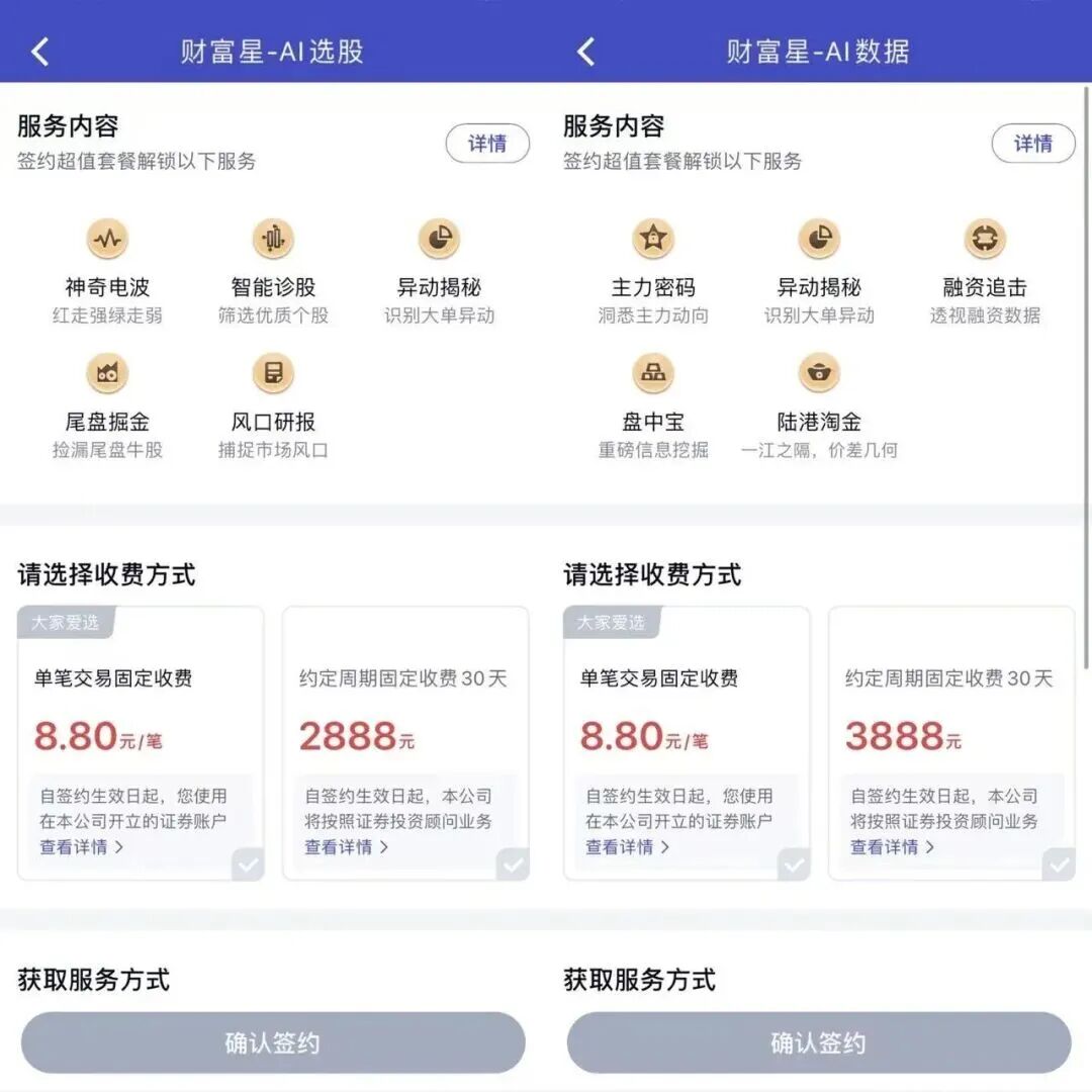 当然,目前声量更大的还是各大券商推出的AI选股,并已经开始收费,从月费几百到3888元不等。中国银河证券推出了智能投顾服务——财富星AI投顾,其包含AI选股、AI数据和AI ETF三大功能。