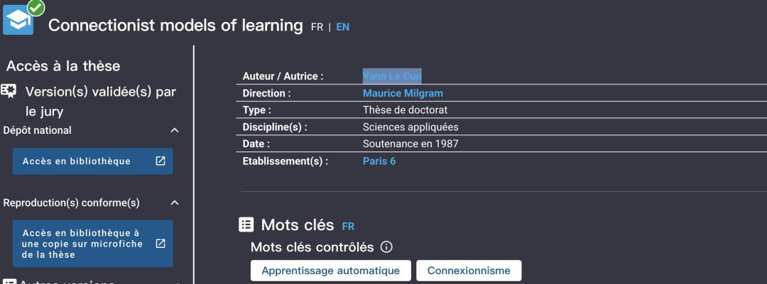 在1987年,他在现在的索邦大学(Sorbonne)获得博士学位,论文英文标题是《Connectionist Learning Models》「连接主义学习模型」。
