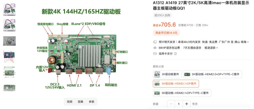 同时,厂商也有能力针对面板开发专门的驱动板,实现 HDR、防蓝光和护眼等进阶功能。这些驱动板基本都不单独外售,只能到二手市场碰运气,或者选择通用的驱动板。