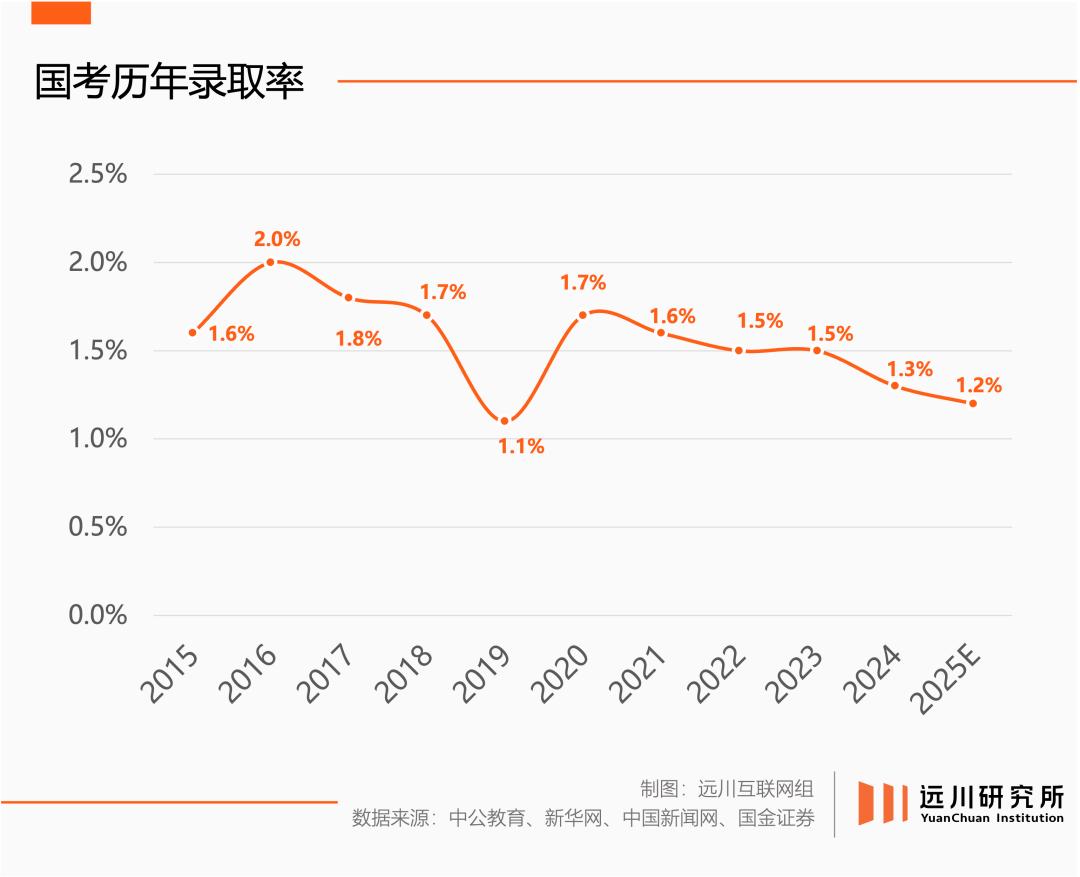 考公市场越火热,中公教育越痛苦。以国考为例,2021年至2024年,国考报名人数翻了近一倍,录取率却从1.6%变成了1.3%,坑位的增速远远落后于萝卜的长势。