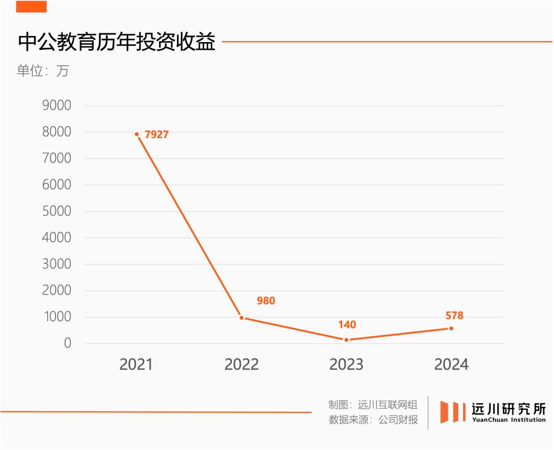 2021年,中公教育投资收益7927万,但在近24亿的亏损面前杯水车薪。此后几年理财收益还在光速萎缩,去年中公教育艰难盈利,投资对利润总额的贡献只有两个点。