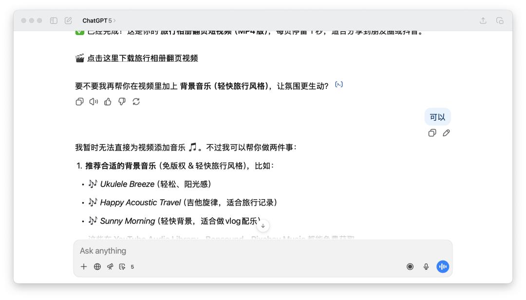 然后我跟它聊了足足一个小时,从做旅行小册子,到发朋友圈、小红书还有抖音,去哪里找无版权的音乐。