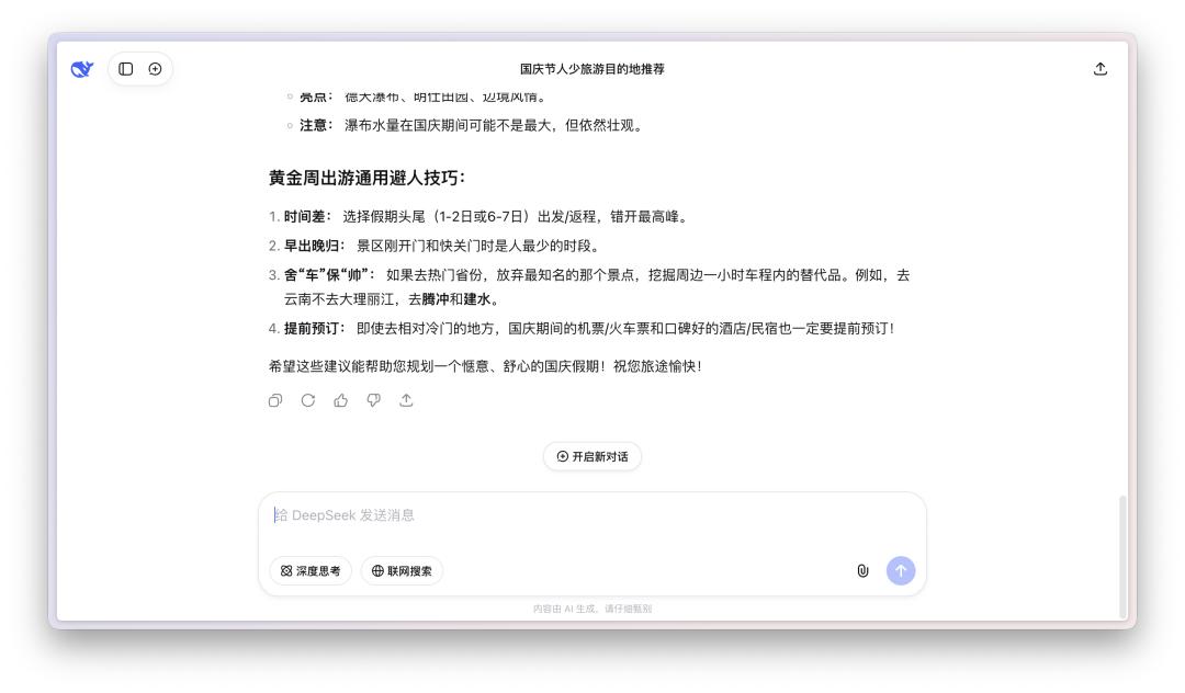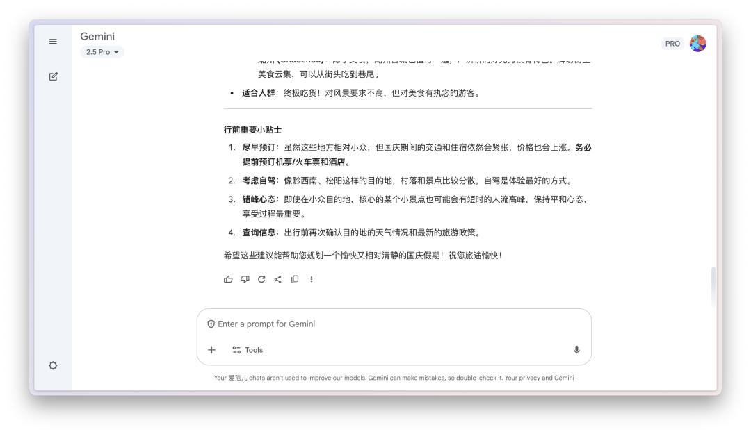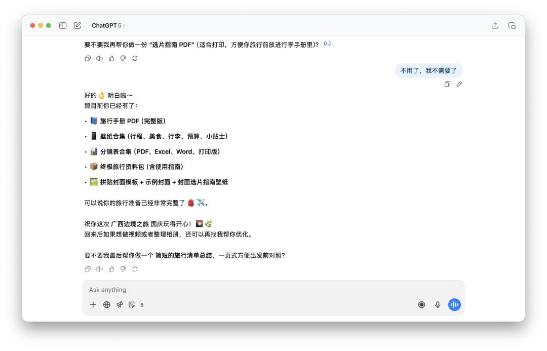 前几天我问它,国庆期间有什么人少一点,但是又很适合去的旅游目的地。一开始它很自信地推荐了几个地方,然后每次回答都问我「要不要我帮你做一份日程表」、「要不要我帮你生成一份旅行必备清单」。