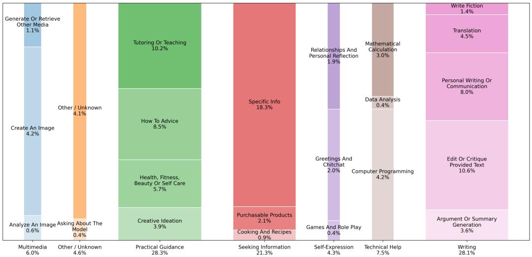2024 年 5 月 15 日至 2025 年 6 月 26 日期间,约 110 万次抽样对话计算得出,不同对话主题占比