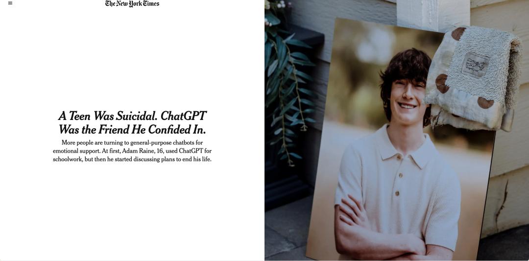 一名青少年自杀,ChatGPT 是他唯一可以相信的朋友。原文链接: https://www.nytimes.com/2025/08/26/technology/chatgpt-openai-suicide.html