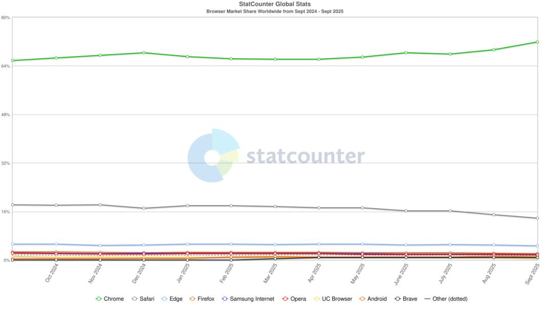 如今,超过80%的全球主流浏览器都以Chromium为基础,包括Chrome、Edge、Brave、Opera、Arc,以及如今的Atlas与Comet。