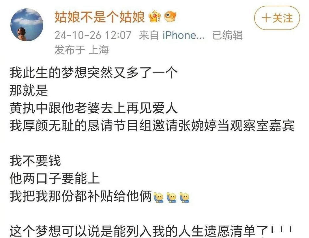 第二季嘉宾张婉婷在微博喊话让黄执中也去参加情感综艺。(图/微博@姑娘不是个姑娘)