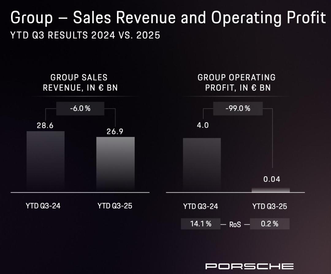 受第三季度拖累,保时捷前三季度销售利润仅为4000万欧元,与去年同期的40.35亿欧元相比暴跌99%。