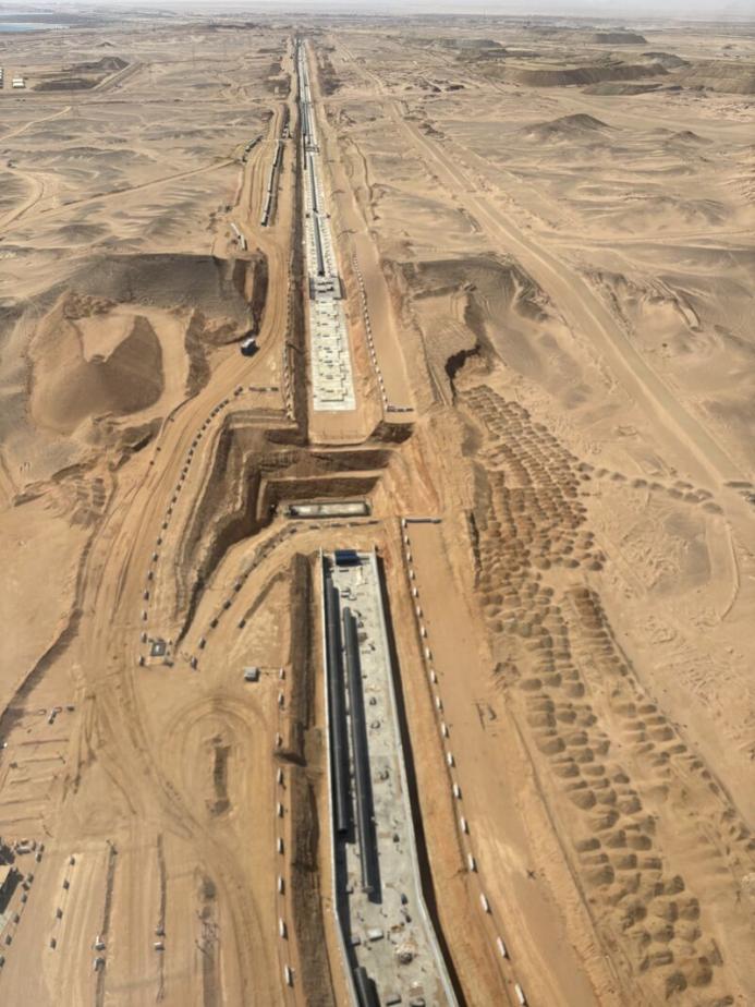 不过所有这些问题在王室看来不过是钱的问题,为了加快项目上马,小萨勒曼将原定5000亿美元预算拔高到上万亿美元,于是在一片片欢呼声中,NEOM未来城开始了项目动工,没过多久就在一片黄土沙漠中划出了一条宏伟的横沟,城市雏形已经隐约可见。