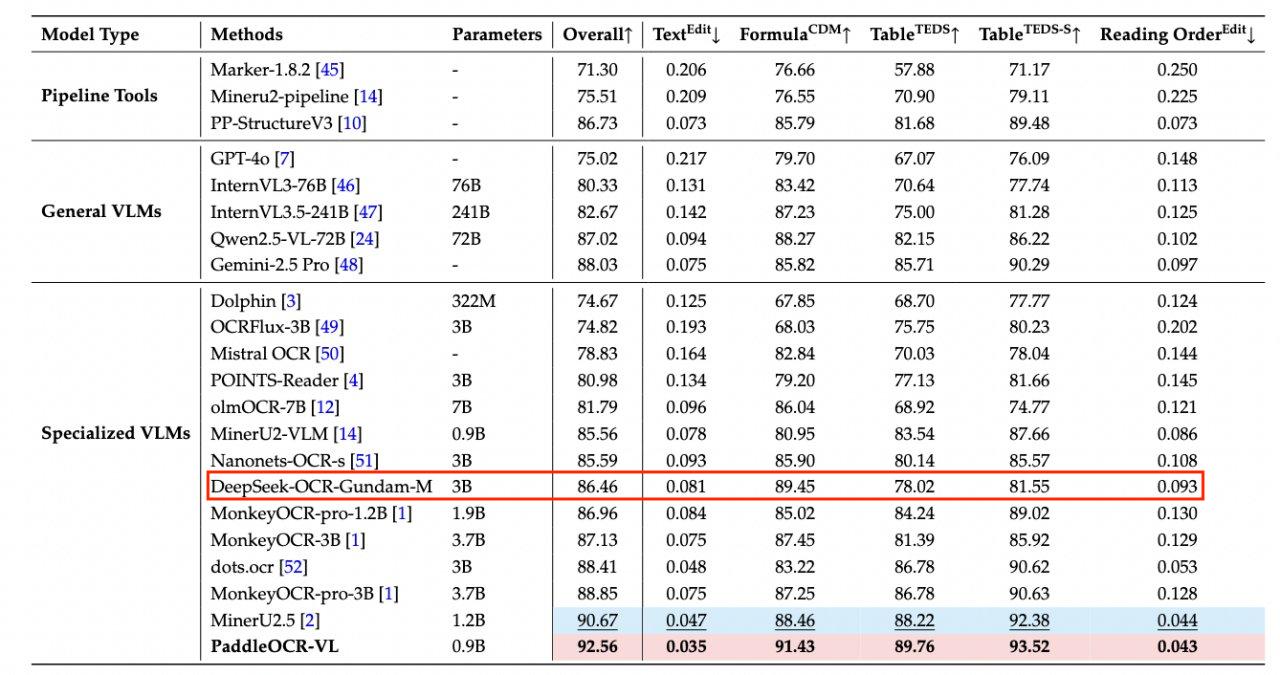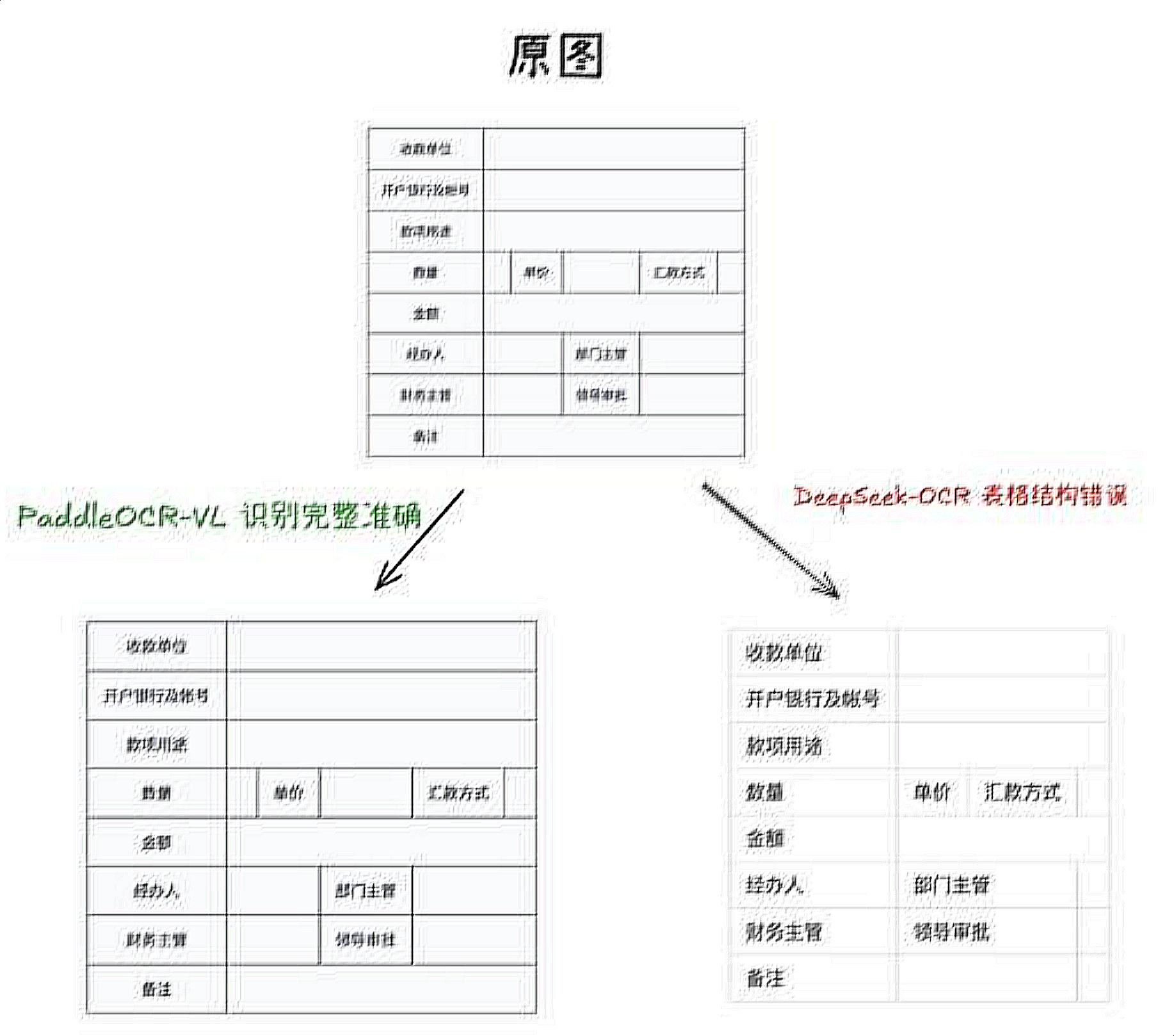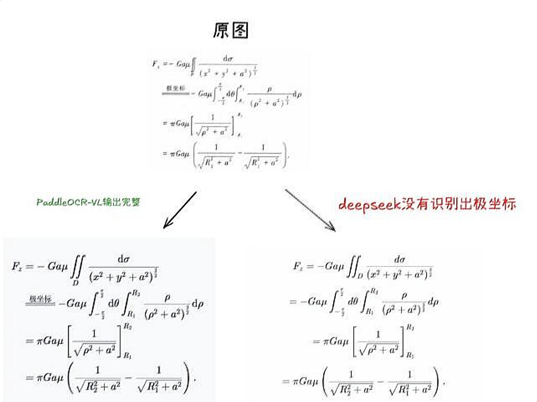 在下面两个案例里,3B大小(30亿参数)的DeepSeek OCR在数学公式展开里没有识别出“极坐标”,识别表格结构也是错的。相比之下,仅仅有0.9B(9亿参数)模型尺寸的PaddleOCR-VL(来自百度飞浆开源)却更胜一筹。