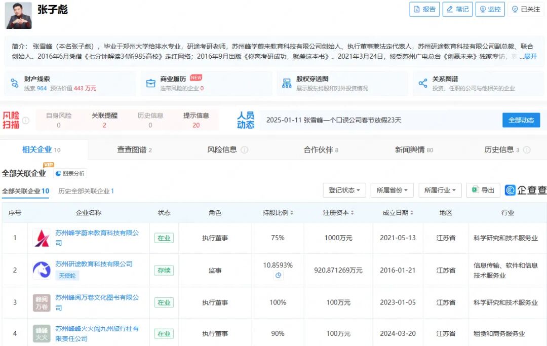 今年9月,企查查发布消息,张雪峰(原名张子彪)名下关联10家企业,8家为存续状态,包括苏州峰学蔚来教育科技有限公司、苏州研途教育科技有限公司等,此外其间接投资有超140家企业,行业涉及科学研究和技术服务业等。