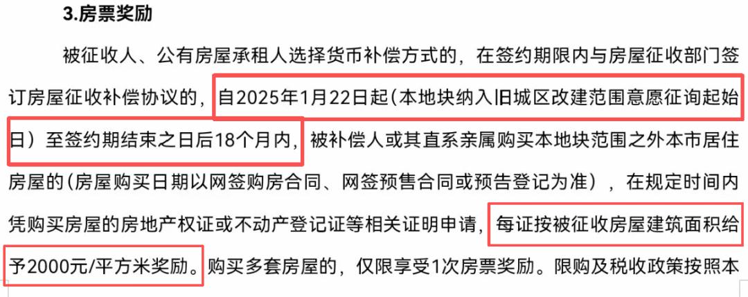 在徐汇江南新村的补偿方案中,“房票奖励”明确选择货币补偿方式后,在2025年1月22日起至签约期结束后18个月内买房,给予2000元每平方米的奖励,而且可以与其他签约奖励并行。
