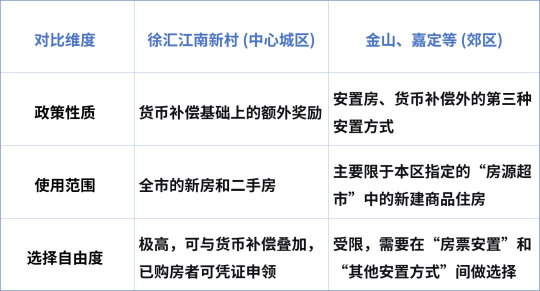 如果金山、嘉定实行的房票安置政策是一张拥有票面金额和使用条件的“代金券”,那么徐汇区房票奖励更像是刺激购房消费的“消费券”。