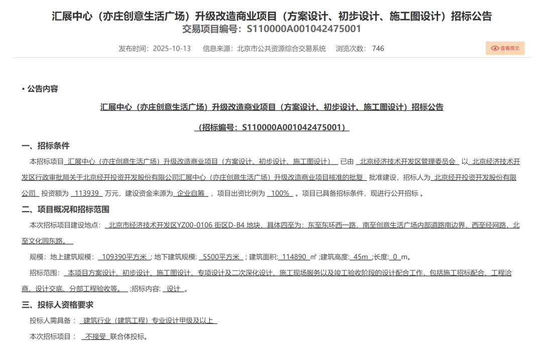 近日,北京市公共资源交易服务平台发布公告,亦庄创意生活广场(汇展中心)正式启动投资约11.4亿元的升级改造工程。该项目由北京经开投资开发股份有限公司投资建设,目前已完成项目核准并进入设计招标阶段。