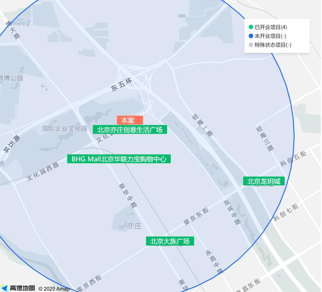 据赢商大数据,亦庄商圈当前商业总存量达39万㎡,市场竞争集中于存量项目迭代。该项目3公里范围内,拥有北京龙玥城(15万㎡)、BHGMall北京(7.3万㎡)、北京大族广场(6.5万㎡)等项目,均以零售为主导业态,同质化竞争显著。