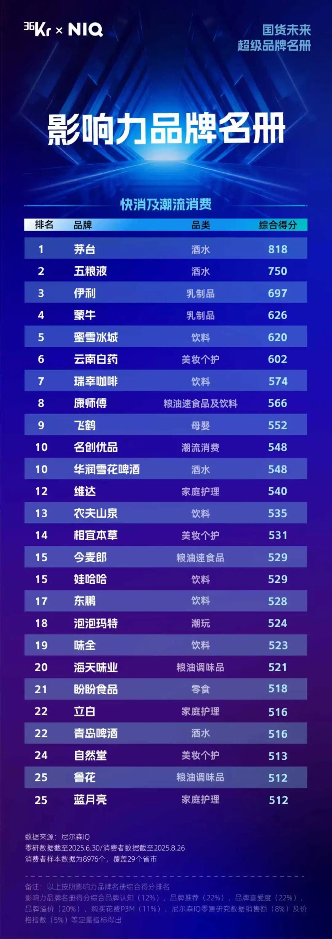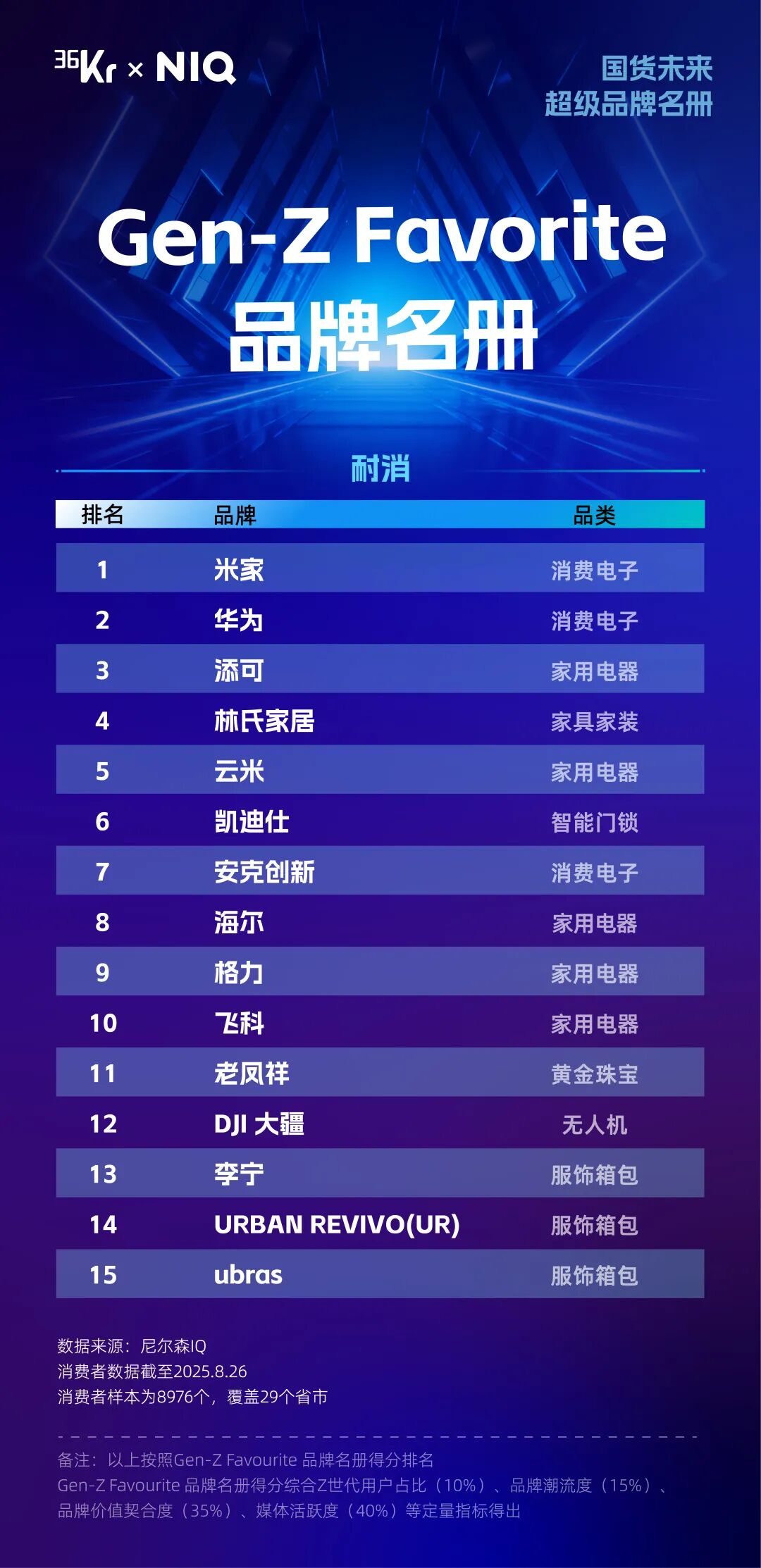 正是在这样的背景下,36氪联合尼尔森IQ共同发起了“国货未来 超级品牌”评选活动。作为深耕科技创新与商业生态的新型服务平台,36氪长期跟踪消费赛道,深度解析品牌成长路径,而尼尔森IQ作为全球领先的消费者研究与零售监测公司,拥有覆盖全球90多个国家和地区的零售监测网络。基于对中国消费市场的共同洞察与研究共识,双方于今年6月启动该评选活动,致力于挖掘具备长期价值与未来影响力的国货品牌。