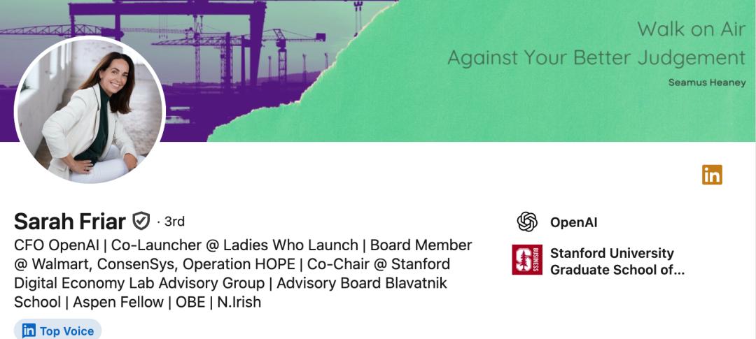 Sarah Friar曾是高盛的股权研究分析师,在Salesforce和Block担任过高级财务职位,去年才从社交网络应用Nextdoor的CEO位置上跳槽到OpenAI。