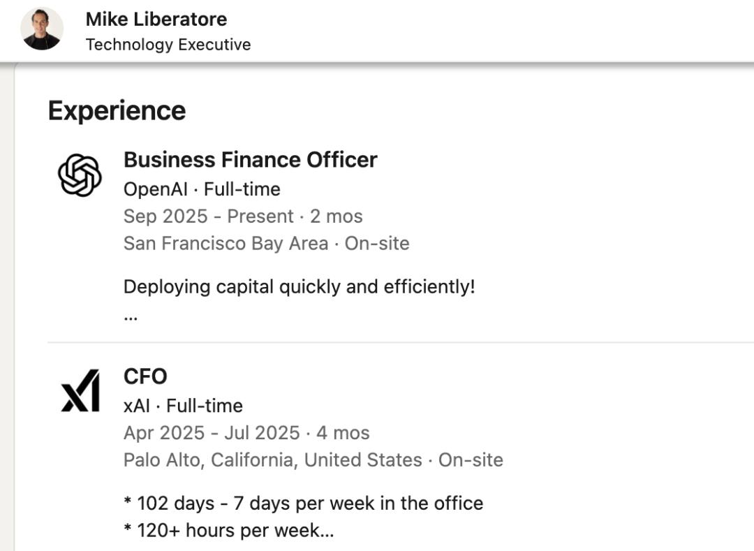 奥特曼正在扩充他的顾问团队,9月份刚挖来了马斯克xAI前CFO Mike Liberatore担任业务财务官,或许还有更多的大交易还在路上。
