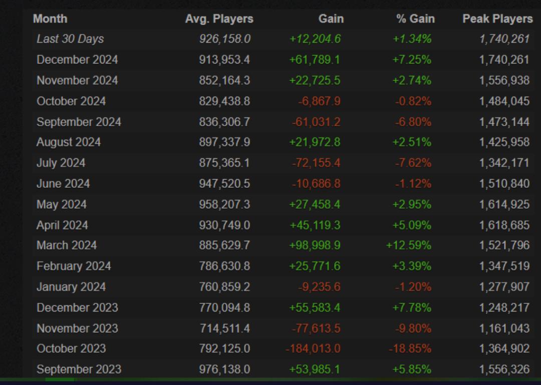根据SteamCharts网站的数据显示。这款游戏在最近2、3年运营稳定,甚至配合一些重大的点进赛事节点,还会迎来数据高峰,例如2020年4月或2024年5月。2023年5月,CS:GO的实时玩家人数达到历史峰值,同时在线玩家人数超过180万。在整个2025,玩家人数保持稳定高位,在150–160万左右波动,略高于2023年的平均120–140万。
