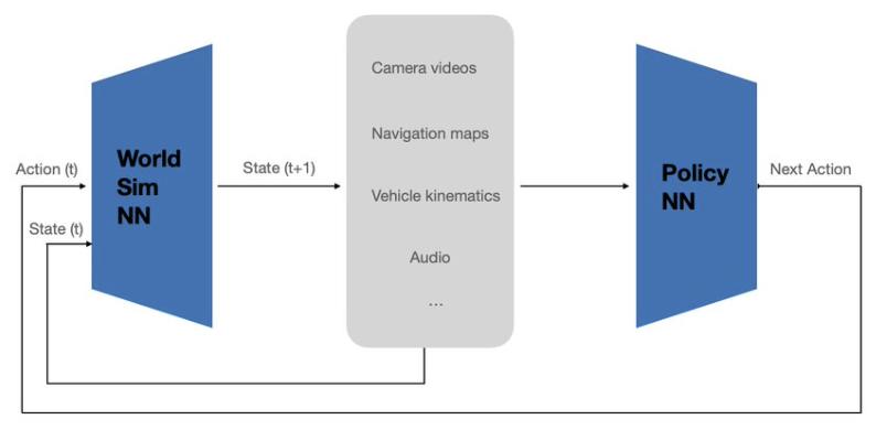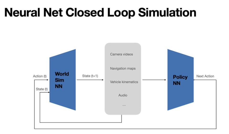 该模拟器使用特斯拉筛选出的同样的海量数据集进行训练,其功能并非预测给定状态下的行动,而是根据当前状态和下一步行动来合成未来状态。
