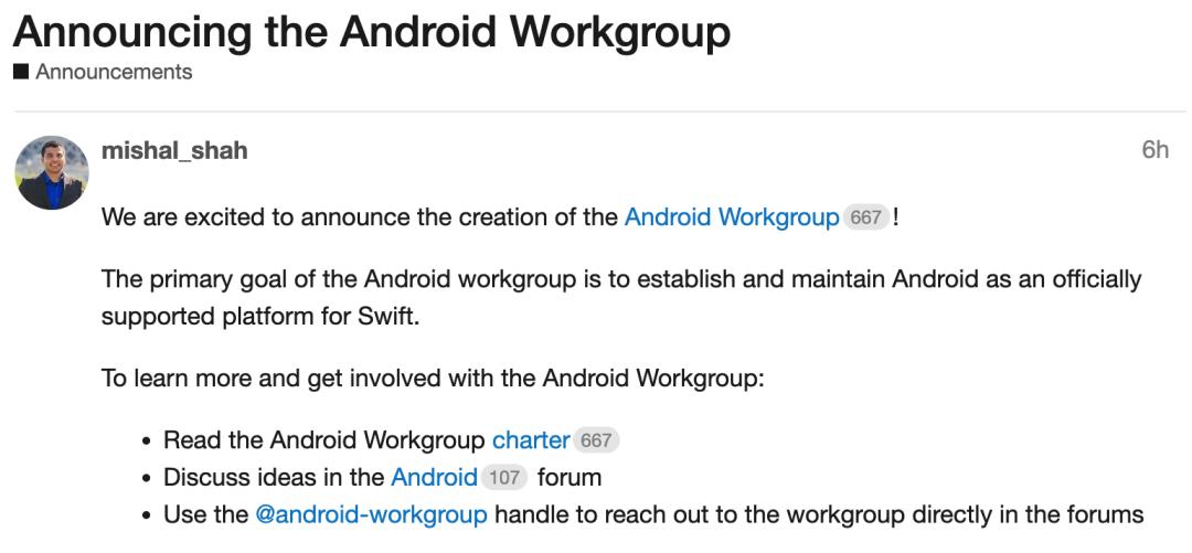 其实这次 SDK 的发布出自今年早些时候成立的 Swift Android 工作组之手。