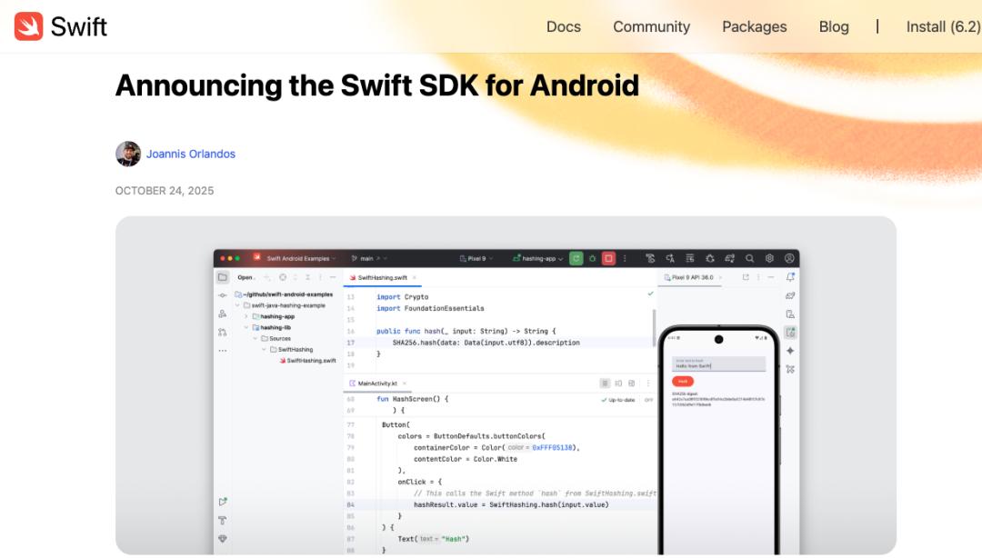 毕竟 Android 在全球占比超过 70%,这一举措可能鼓励更多开发者采用 Swift,同时保留技能在跨平台上的价值。这也给 Flutter、React Native 等主打“写一次,到处运行”的跨平台框架带来压力。不过正如 Swift.org 博客所强调的,这套 SDK 更注重原生性能,而不是折中方案,这对讲究效率的开发者特别有吸引力。