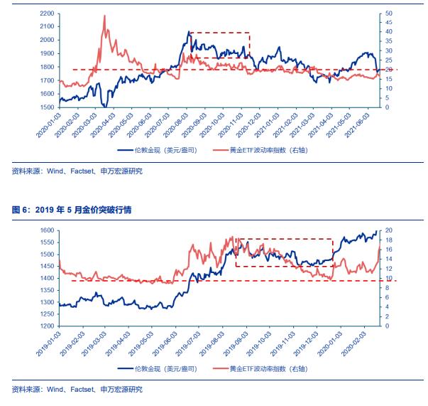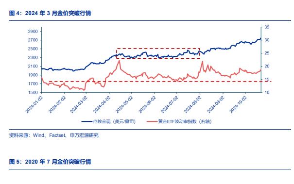 复盘黄金在2019年5月、2020年7月、2024年3月、2025年2月的几轮突破行情,研究发现一个重要规律:波动率回到启动前的低位,是新一轮上涨或下跌行情启动的前提。