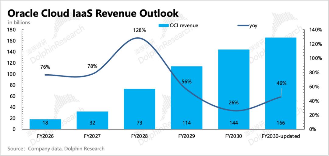 作为与OpenAI捆绑最深的一方,甲骨文也是赌上身家了。好的是,未来的收入增长几乎由OpenAI决定,OpenAI也会尽可能把最多的算力需求订单给到它,比如27年开始的5年3000亿订单。这才有了Q2业绩会上“炸裂”的长期增长指引,以及AI World大会上的“任性”上调: