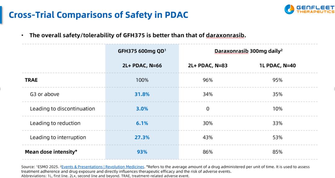 而从安全性来看,相较于RMC-6236,GFH375治疗PDAC显示了更好的安全性特征。如下图所示,细分人群来看,GFH375在二线患者群体中的治疗相关不良事件(TRAE)多为1-2级,经支持性治疗后可恢复。3级及以上的反应甚至低于RMC-6236的一线治疗。GFH375的平均剂量强度(Mean dose intensity)达到93%,这意味着GFH375研究中,患者实际用药剂量几乎接近临床计划标准,进一步证明了实现疗效与安全性/耐受性的较好平衡。