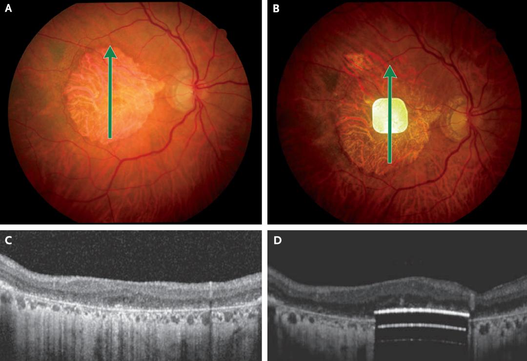 38 名干性 AMD 受试者都接受了植入手术,一年后,80% 的患者视力显著改善(≥0.2 logMAR),多数人重新能够阅读字母、数字和单词,且周边视力完全不受影响(使用近红外光,不会刺激残余感光细胞,也不会干扰自然余留视力)。